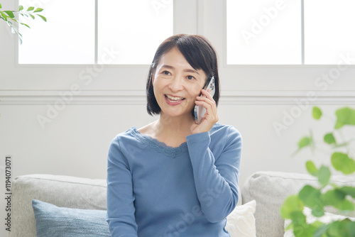 woman, middle-aged, smartphone, call, smile, speaking, call, home, call, wear, 50's, possess, contact, house, conversation, drape, advisory, couch, seated, living room, smartphone, room, indoor, indoor, mobile phone, japanese, asian