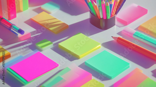 デスクトップに並んだカラフルな付箋とペンが生み出す明るい作業空間