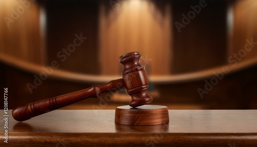 법정 안의 나무 법봉, 짙은 색 나무로 만들어진 법봉과 조각된 법정 심벌이 함께 놓인 테이블 위의 정경