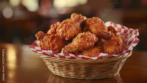 バスケットに盛られたクリスピーなフライドチキンの食欲をそそる風景