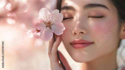 桜の花を手に取り微笑む着物姿の日本人女性のクローズアップ