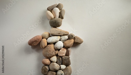 불규칙한 형태의 돌들이 조화를 이루는 인간 형상, 서로 다른 사회적 역할들이 결합하여 하나의 형태를 이루는 과정을 나타낸다