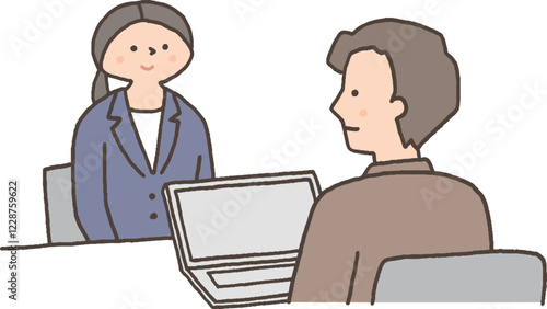 people, personal computer, illustration, business, notebook, vector, work, man, woman, japanese, smile, young, personal computer, cyberspace, sweet, businessman, waist up, interview, meeting, discussion, meeting