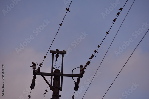 telephone pole, wire, sparrow, powerline, copy space, landscape, japan, blue skies, dusk, silhouette, shadow, open air, power, electricity, sky, flock, power, cable, energy, electric, line, wire