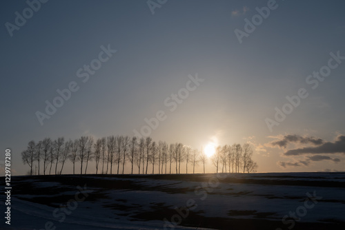 雪解けの丘とシラカバ並木