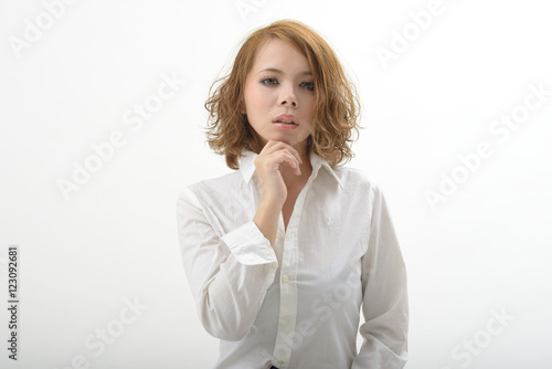 expression, beauty, white, russian, brown-haired, blond, shirt, sexy, sweet, pretty, her, woman, japanese, young, model, pose, waist up, smile, hand, problem, apprehension, neck, white background, cosmetic, este, style, breast, bust, eye, white, skin, ear