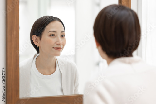 woman, skincare, mirror, look, cosmetic, beauty, japanese, smile, make-up, make-up, cleansing, make-up, beauty, people, skin, toilet water, beauty, cosmetic, pretty, japan, face, hand, middle-aged, bathroom, young, 50's, short hair, shortcut, waist up, indoor, lovely, clean, casual, house, home, indoor, light, morning