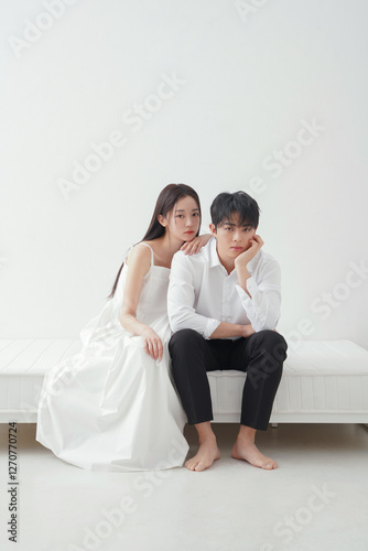 shirt, cool, people, portrait, couple, couple, lover, two people, asian, korean, japanese, young, house, room, bedchamber, bed, daytime, cosmetic, care, beauty, skincare, skin, cosmetic, make-up, fashion, casual, model, fun, happy, sweet, pretty, beauty, cool, good-looking