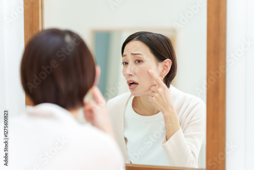 30s, woman, dryness, skin, cosmetic, toilet water, japanese, lifestyle, short hair, homemaker, profile, copy space, casual, enzyme, beauty, smile, skincare, white background, portrait, sunblock, asian, natural, pretty, smile, middle-aged, refreshing, cosmetic, people, indoor, indoor