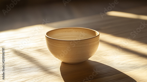 夕日が差し込むテーブルに映るコーヒーカップの影、幻想的な光と陰の調和