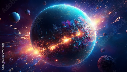 거대한 행성이 픽셀처럼 해체되며 입자로 퍼지는 장면