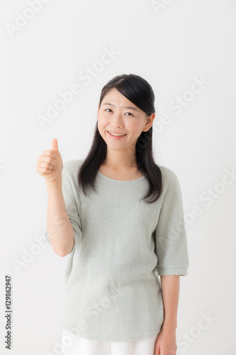 smile, people, woman, japanese, asian, black hair, young, 30s, casual, white background, room, indoor, indoor, homemaker, thumb, passed, success, permission, ok, ok, ok