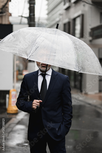 suit, businessman, rain, umbrella, rainy season, damp, typhoon, walk, portrait, weather, business, man, man, manager, attendance, middle-aged, good-looking, cool, open air, outside, people, japan, japanese, work, employee, salaried employee, businessman, waterdrop, pressed for time, torrent, business travel, trip, walk, president, bad weather, way