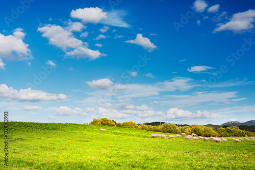 sky, landscape, field, grass, green, nature, meadow, blue, summer, cloud, rural, hill, countryside, spring, farming, forest, farm, land, country, horizon, scenic, work, season