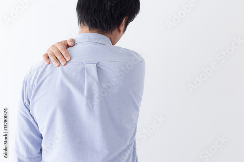 people, man, japanese, asian, young, 30s, white background, room, indoor, indoor, casual, shirt, closeup, up, shoulder, spicey, arduous, painful, pain, fatigue, poor health, health, health care, stress, overwork, attitude, foul, back, rear, back, back