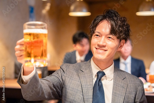 居酒屋でビールの乾杯をするサラリーマンの男性