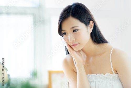 smile, skincare, cosmetic, beauty, missy, people, japanese, young, woman, lifestyle, face, pretty, light, sweet, smile, beauty, girl, room, indoor, camisole, indoor, este, portrait, make-up, make-up, care, health, cotton, mirror, cheek, skin, copy space, relax