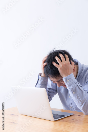 white background, people, man, japanese, young, 30s, casual, personal computer, personal computer, notebook, cyberspace, mail, work, work, business, home, entrepreneurship, sideline, businessman, salaried employee, employee, corporation, unrest, apprehension, disapproval, embarrassment, drop, foul, mourn, shock, trouble, contemplate, thought, spicey, stress, negative, unhappy, flop, depression, depression