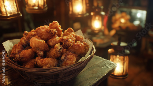 evening, meal, chicken, stall, basket, woody, table, warm, lighting, light, lantern, table, open air, tone, epicurean, hood, chicken, crispness, night, town, handcraft, light, sky, shadow, image, savour, food, shade, background, retro, dish, deli