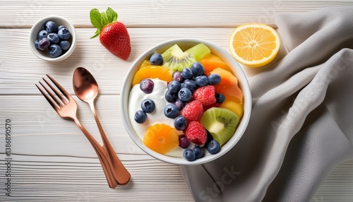 breakfast, yogurt, fruit, salad, woody, table, grey, clothes, natural, plate, table, light, morning, gentle, light, cutlery, material, symmetry, beauty, meal, fruit, dish, peace, tone, nature, dish, food, elegant, clean, fresh, calm, light, tone, tenderness, balance, sophistication, landscape, healing
