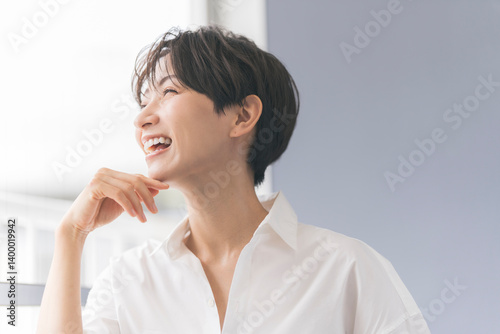 cosmetic, skincare, clean, health, beauty, beauty, woman, smile, profile, cheek, touch, face, skin, relax, sunblock, beauty, japanese, asian, portrait, lifestyle, copy space, light, 30s, toilet water, indoor, indoor, people, waist up, white