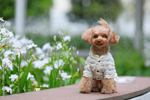 白い花が咲く庭園で記念撮影するトイ・プードル
