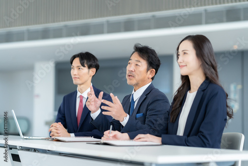businessman, meeting, business, office, personal computer, meeting, presentation, meeting, woman, man, team, trade, adviser, planner, presentation, interview, people, smile, young, manager, boss, secondary, employee, notebook, colleague, work, work, suit, corporation, ol, 30s, 50's, japanese, asian, profile, table, seated, waist up, teamwork