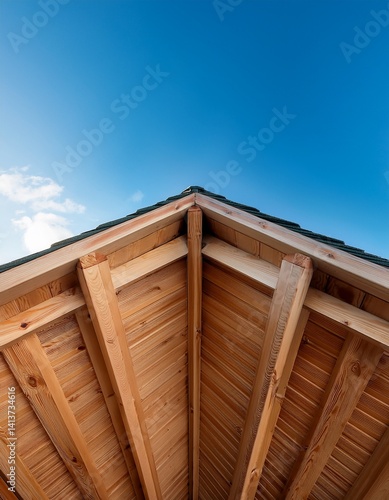 木材の屋根のディテールが美しいクローズアップ。青空を背景に、自然の素材が引き立てられ、温かみのある景色が広がる。