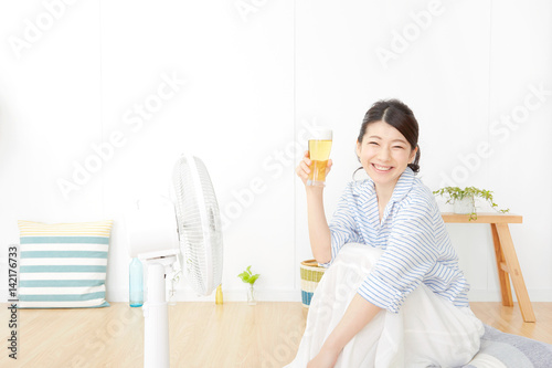 woman, waist up, ales, draft beer, glasses, drink, possess, cup, room, living room, fan, spend, indoor, cool, indoor, house, home, lifestyle, white background, japanese, smile, smile, asian, relax, smile, joyful, rejoice, liqueur, liqueur, summer, young, pretty, sweet, alone, casual, fun