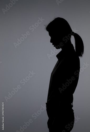 woman, portrait, silhouette, shadow, droop, drop, discouraged, despair, stern, apprehension, fear, profile, flop, lose, loss, grey, black, negative, shade, pose, dynamic