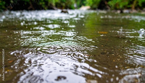 雨が小川のせせらぎに打ち、波紋が水面に広がる様子が繊細で美しいディテールに映し出される