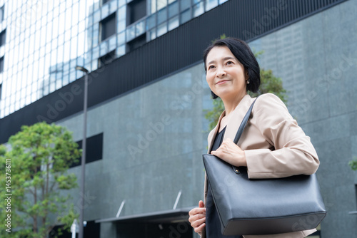 business, woman, commute, businessman, manager, executive, manager, president, career woman, people, smile, attendance, walk, business district, building, highrise, work, work, suit, bag, bag, office, 50's, 60's, open air, japanese, asian, waist up, profile, businesswoman, woman, smiling, person, suit, corporate, smile