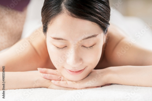 明るい雰囲気のエステサロンでマッサージを受ける若い女性