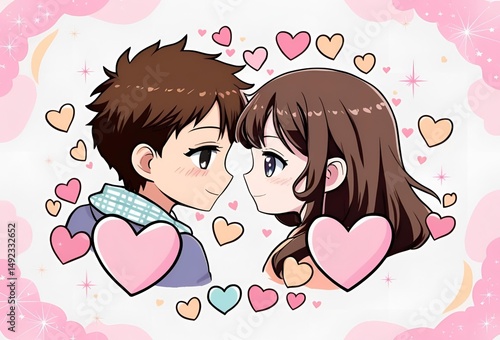見つめ合う恋人のアニメ風イラスト