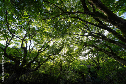 京都の寺院の楓の緑がきれいな境内