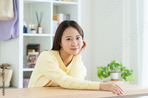 woman, young, missy, house, home, house, residence, living room, lifestyle, student, table, seated, waist up, face, copy space, light, refreshing, woman, home, smiling, person, indoor, familiar, happiness, indoor, indoor, room