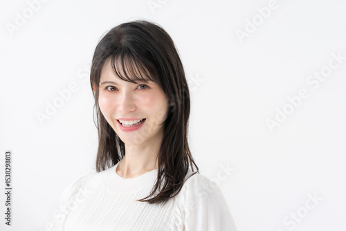 asian, japanese, woman, long hair, black hair, 30s, white background, casual, portrait, portrait, homemaker, ol, freelance, hair salon, smile, smile, people, cut-out, waist up, beauty, coiffure, copy space, light, lifestyle, live, clean, indoor, relax, make-up, make-up, health, cosmetic, hair salon, health care, lively, beauty, vacation