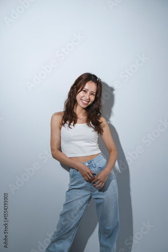 woman, gal, jean, cosmetic, make-up, dress, coiffure, up, hair, fashion, style, face, person, glamour, model, studio, 1, lady, eye, brunette, skin, elegant, look, sweet, beauty, japanese, pose, slim, figure