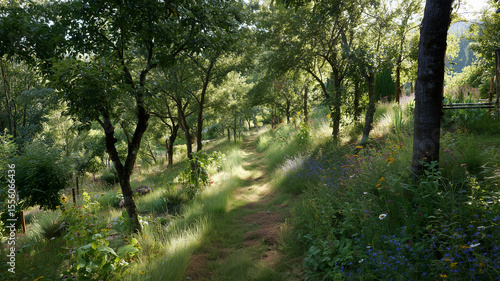 citrus fruit, olive, almond, mint, rosemary, organic, fertility, training, workshop, biodiversity, irrigation, rail, pathway, lightning, shade, contrast, textured, outdoors, natural