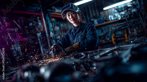 japanese, woman, coverall, glove, helmet, spark, workshop, bodywork, fix, frame, worktable, tool, cabinet, light, shadow, expression, smile, technology, labor, concentration, achievement, industry, maintenance, improvement, precise, safe, equipment, metallic, texture, vignette, tone, lifestyle