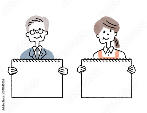 スケッチボードを持っている元気に働く高齢者の男性と女性