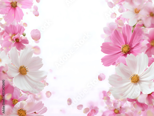 白い背景に映えるピンクと白のコスモスの花のフレーム構図