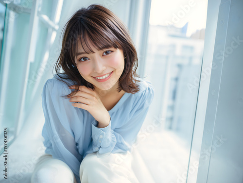 窓辺に座り柔らかな笑顔を見せる可愛い日本人女性のポートレート