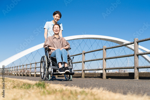 portrait, model, woman, woman, japanese, japan, 30s, 50's, 60's, young, young, middle-aged, age, aged, care, nurse, assistance, two people, walk, wheelchair, injury, injury, push, walk, speaking, conversation, morning, chum, positive, smile, smile, health, poor health, marode, hospital, winter, court, promenade, stream, bridge, sky, sunny, blue skies, natural