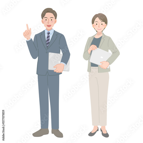 businessman, notebook, man, woman, possess, personal computer, personal computer, illustration, point, vector, business, salaried employee, career woman, boss, 30s, suit, people, work, japanese, work, white background, employee, corporation, flat, two people, set, person, manager, corporate, smile