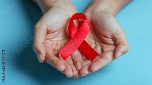 person, hand, palm, wrist, skin, finger, ribbon, red, metaphor, conscious, edification, assistance, benevolence, social, difficulty, health, welfare, medical care, treatment, aids, exercise, campaign, route, safe, life, hope, solidarity, love, sympathy, cooperation, understanding, world, area, community, future, mind, background, pigmentation, blue, texture, shadow, light, space, design