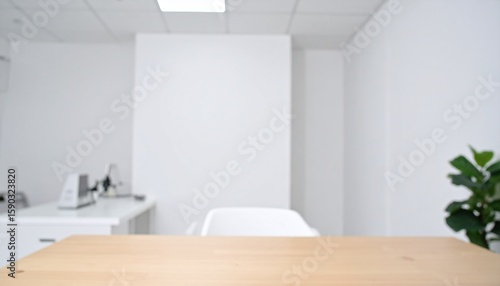 白い壁と家具が調和したモダンなミニマルオフィスに、ライトウッドのデスクと一鉢の観葉植物が自然のアクセントを添えた落ち着いた作業空間