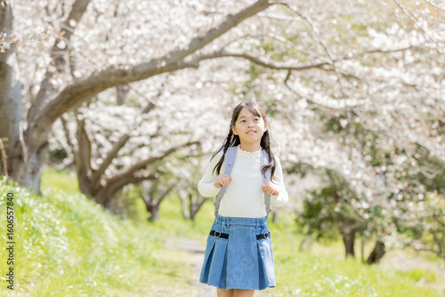 桜並木の下を歩く小学生