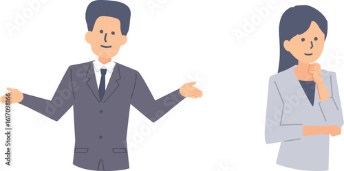 people, salaried employee, employee, suit, woman, career woman, man, businessman, staff, working man, business, contemplate, white background, illustration, clip art, vector