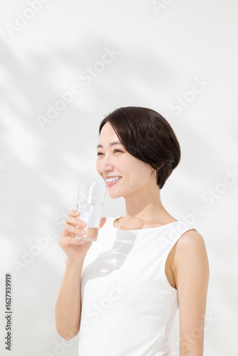 woman, japanese, diet, beauty, cup, mineral water, water, beauty, young, health, people, cosmetic, fitness, drink, smile, exercise, sport, waist up, drink, drink, portrait, refreshing, white background, 30s, middle-aged, beauty, clean, casual, light, detox, short hair, skincare, summer, supplement, shade, awakening, morning, glasses